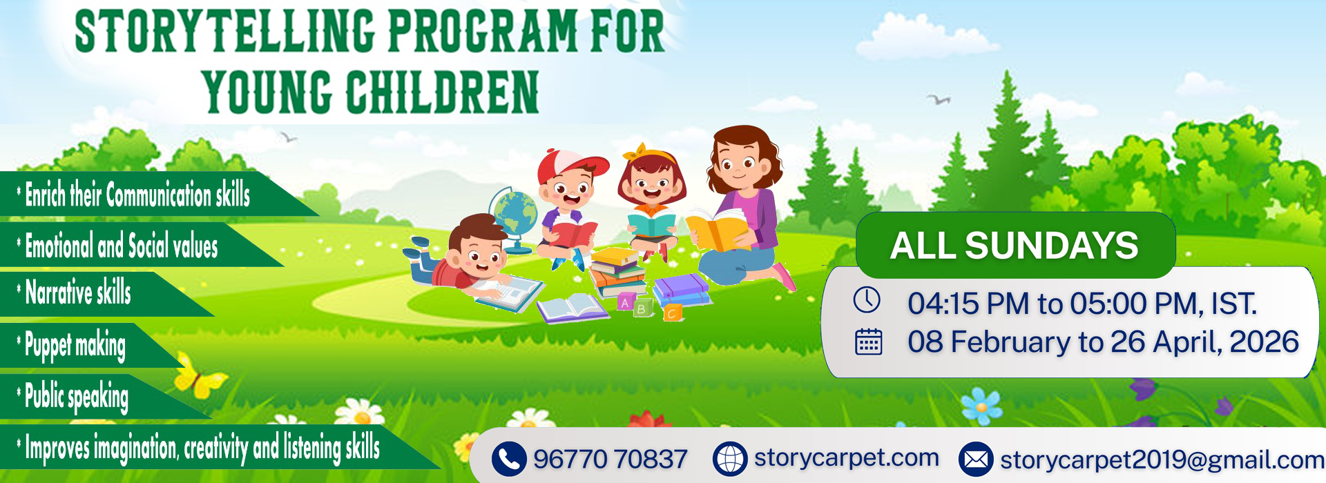 Story Carpet is an educational enterprise that works towards the holistic transformation of Adults and Children based on the 3C model, Creativity, Confidence, and Communication. We achieve the results in each individual by creating unique programs such as Creative Writing, Public Speaking, Storytelling, Behavioral Coaching, and Counseling which have uplifted the personal equity quotient for every human being.